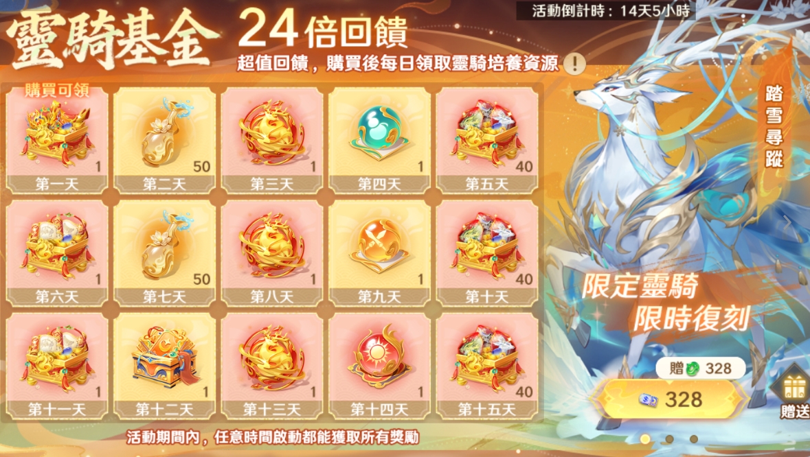 購買“靈騎基金”後,守護使大人可連續15天每天領取超高價值的稀有資源,其中包括天啟靈騎碎片三選一、太虛騎裝二選一、玄霄神玉、太虛獸典二選一、資質丹、靈騎技能任選箱以及楊柳甘露。使用天啟靈騎碎片三選一後,守護使可以在踏雪尋蹤,山岳潛形,紫氣東來這三個天啟靈騎的碎片中任選1個,再加上其他培養道具,守護使大人可以輕鬆對靈騎進行養成~